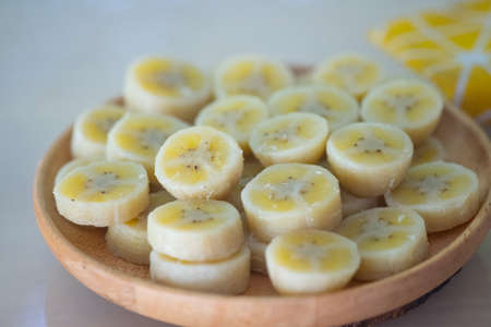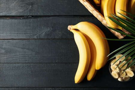 Bananas. Basket with bananas and bowl with slices on wooden background