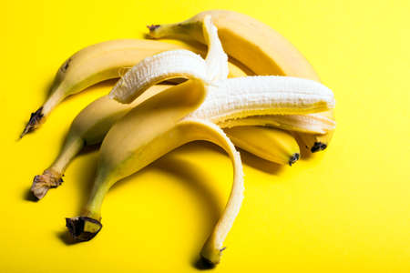 Two ripe sweet testy bananas on yellow background top view with copy space