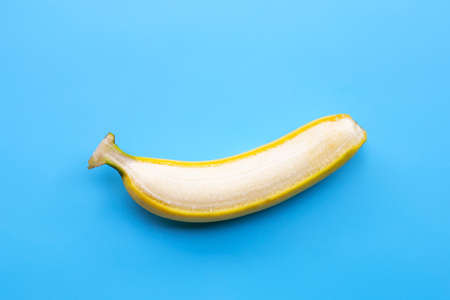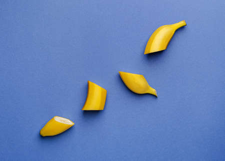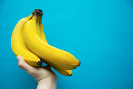 Ripe yellow bananas on blue background, top view. Healthy vegan food