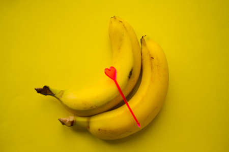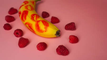 Red lipstick on a yellow banana on a pink background with banana raspberries. Love concept.