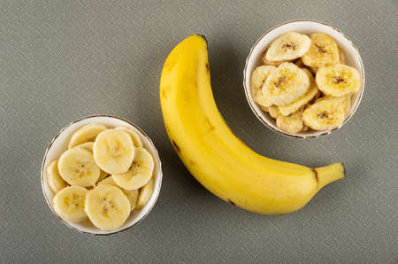 White bowl with slices of fresh banana, whole yellow banana, bowl with banana chips on gray table. Top view