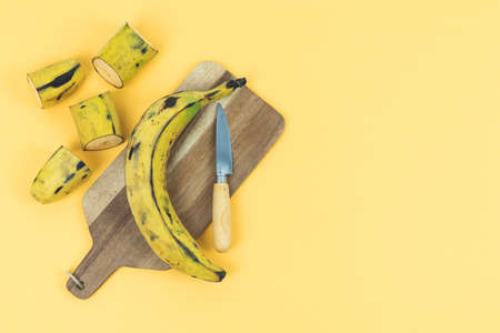Sweet bananas on punchy pastel yellow background, Top view, Copy space