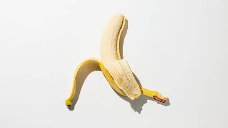Peeled banana made of yellow balloon lay on bright pink background.Minimal ,summer composition.