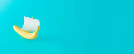 Advertisement idea with a yellow banana like a ship and a sail of paper against pastel blue background. Minimal summer nature concept in horizontal orientation.
