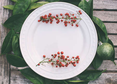 Dinner background, plate and napkin on rustic table, top view with place for text