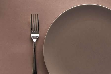 Empty plate and cutlery as mockup set on brown background, top tableware for chef table decor and menu branding design