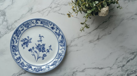 A beautifully designed blue and white decorative plate rests on a marble surface, complemented by subtle greenery. Ideal for culinary presentations or elegant decor.