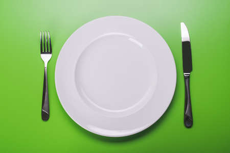 round ceramic plates, fork with knife on a green background, top view. Table setting