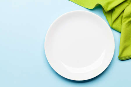 Empty plate and towel on blue background. Top view flat lay with copy space. Template or mockup for your meals