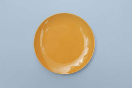 A gray, beautiful plate in the center, on a yellow background, full screen.