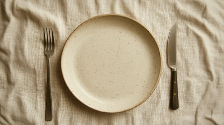 A simple yet elegant ceramic plate with a fork and knife beside it, resting on a neutral-colored tablecloth