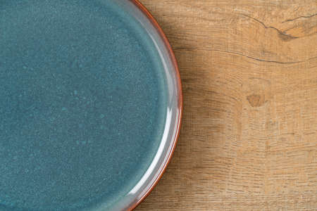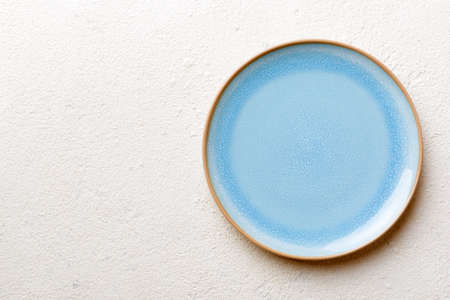 Empty turquoise ceramic plate On a concrete background. Top view with copy space