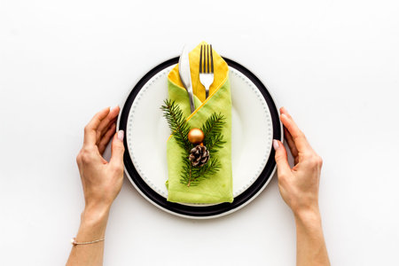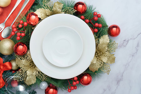 Christmas or New Year table setting with ceramic plate, fir branch with decor and cutlery. View from above. copy space