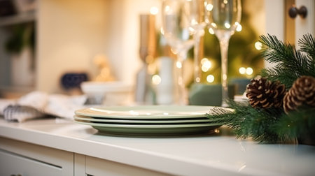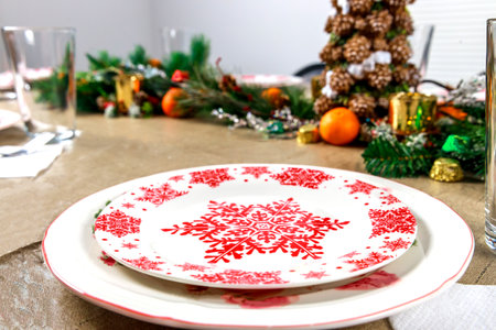 Cutlery and plates neatly placed on the kitchen table with Christmas decor, close-up