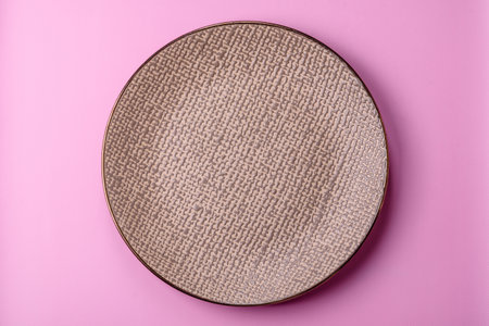 An empty round ceramic plate on a pink background as a kitchen utensil. An empty plate as a food background for your design