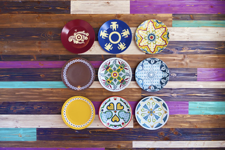 Various colors of dishes decorate on the ceiling, Pattern background