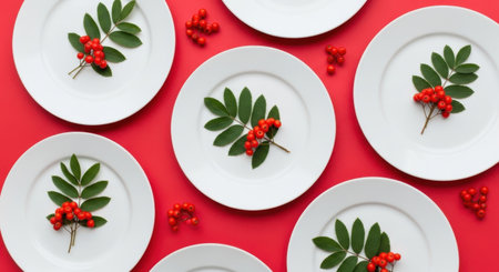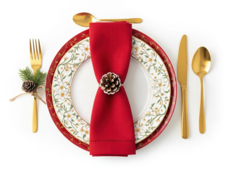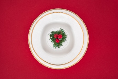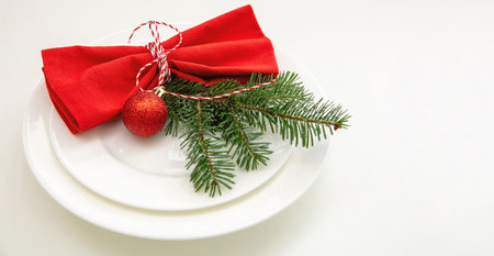 Christmas table setting, celebration dinner. Red cloth napkin and Xmas decoration on plates set, white background