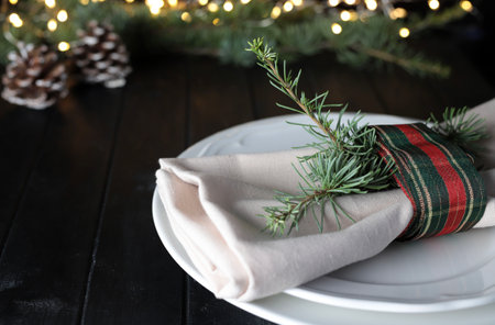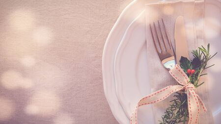 Christmas table place setting, holidays copy space background