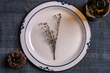 Antique plate on blue Tablecloth