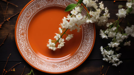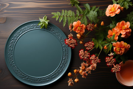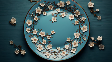Decorative clay plate, on a wood background with copy space.