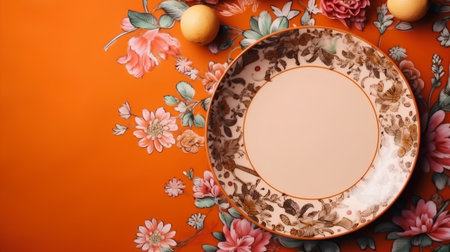 Empty orange plate on dark blue background, top view, copy space