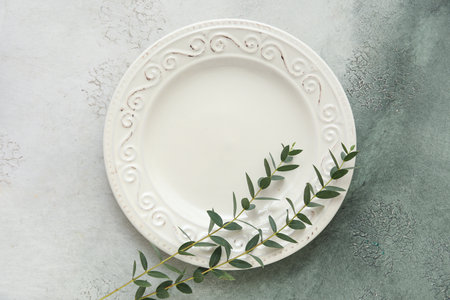 Beautiful table setting with eucalyptus branches on grunge background