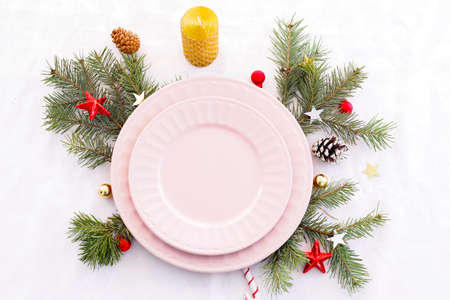 concept of christmas table setting. two empty pink plates, fir branches, cones, christmas balls and stars.