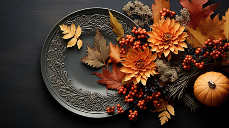 Autumn table setting, green, red and yellow fallen maple leaves and an empty plate, thanksgiving holiday