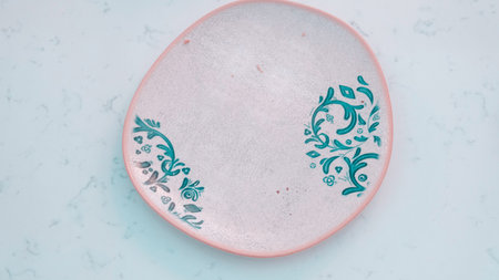 Colorful ceramic plate with floral ornament. Close-up. Select focus.