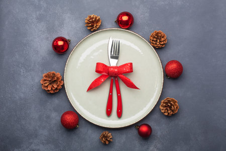 Christmas table setting consisting of a plate and cutlery tied with a bow. Flat lay