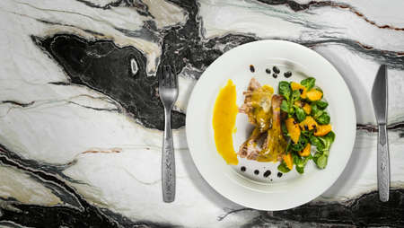 Duck legs with orange sauce and lamb's lettuce salad with oranges and vinegar on white plate on granite counter top.