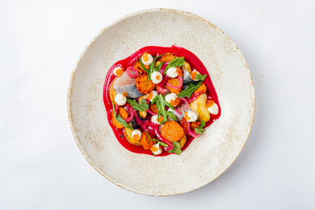 A beautifully arranged plate features an array of colorful vegetables and sauces, artfully designed.