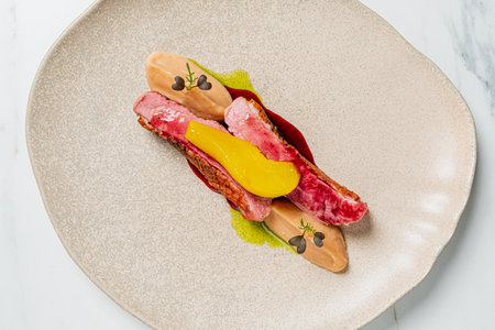 Exquisite presentation of roasted duck served on an elegant plate, accompanied by vibrant sauces.