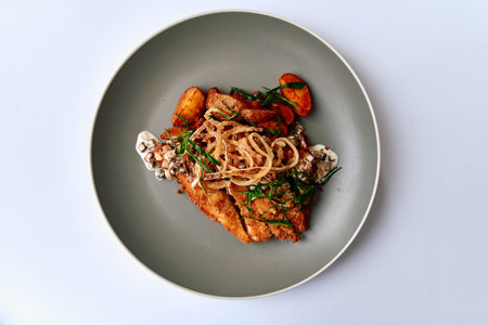 Crispy Fried Fish Plate with Garnishes and Sides, Showcasing a Delicious Culinary Presentation of Flavorful Accompaniments and Textural Elements