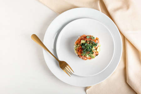 Salmon steak on a vegetable pillow. In a plate. Selective focus