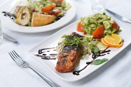 Grilled salmon steak with vegetables on a white plate in a restaurant