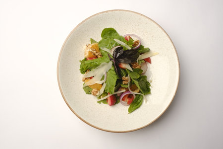 salad closeup. half a white plate. Cooking in a restaurant kitchen.