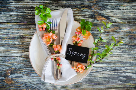Festive table place setting with spring blossoming branch on wooden background. Copy space