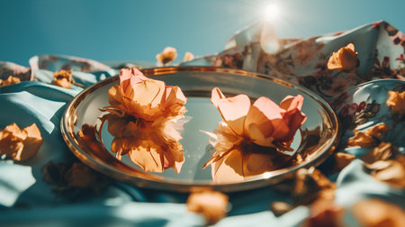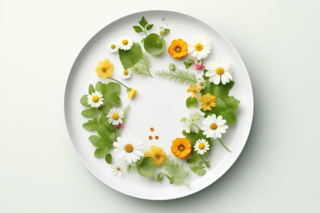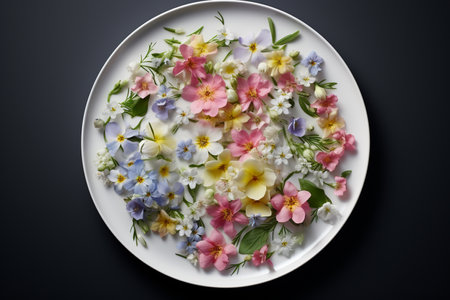 Plate with flowers. The concept of vegan, vegetarian and healthy food. Concept for Womens Day, Valentines Day and romantic anniversaries. Generative AI