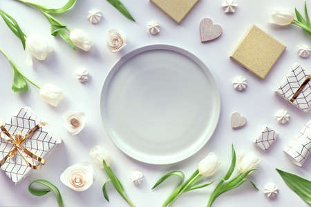 Spring flat lay, top view with white tulips, flowers, geometric decorations - coffee cups, gift boxes wrapped in white hexagon paper with golden pattern, plate with copy-space in the middle.