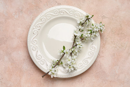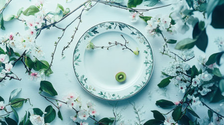 A beautiful white plate centered among soft pink blossoms and lush greenery on a gentle light background, creating a serene and elegant composition.