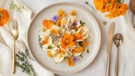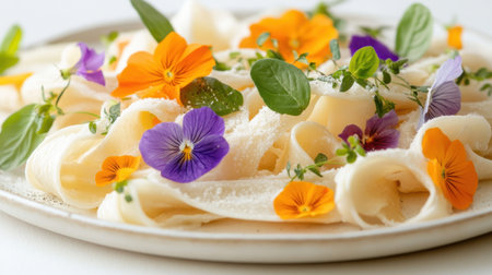 A stunning close-up of fresh pasta adorned with vibrant edible flowers and fragrant herbs creates an elegant presentation, perfect for food photography.