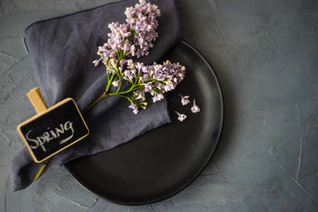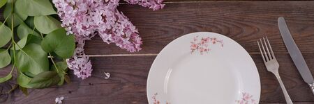 Spring table setting with lilac flowers on rustic table with copy space