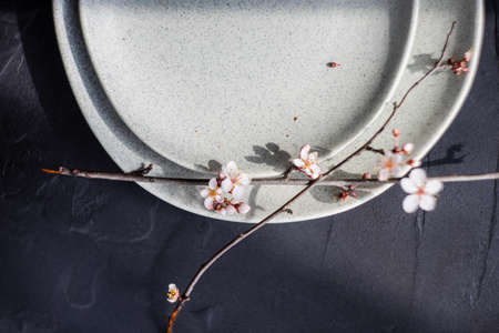 Empty ceramic plate with branch of blooming apricot on dark background