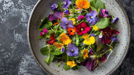 This stunning plate showcases a vibrant arrangement of edible flowers and fresh herbs, creating an exquisite presentation suitable for gourmet dining.