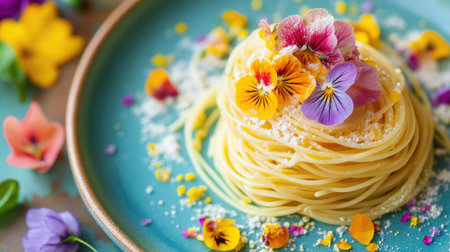 A stunning spaghetti dish topped with a variety of vibrant edible flowers, set on a turquoise plate. Perfect for highlighting gourmet cuisine and fresh ingredients.
