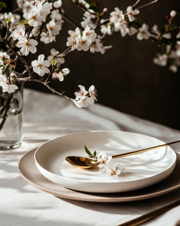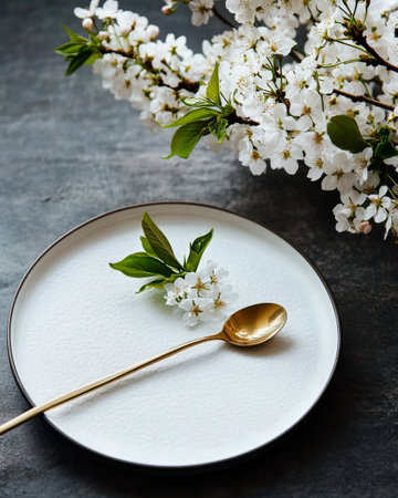Delicate cherry blossoms rest on a minimalist plate alongside a golden spoon, creating a serene and calming tabletop setting. Natural light enhances the elegant simplicity.