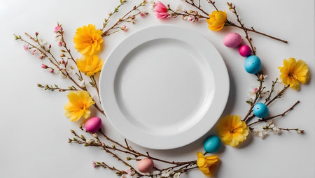 Easter table setting with white plate and spring flowers on white background