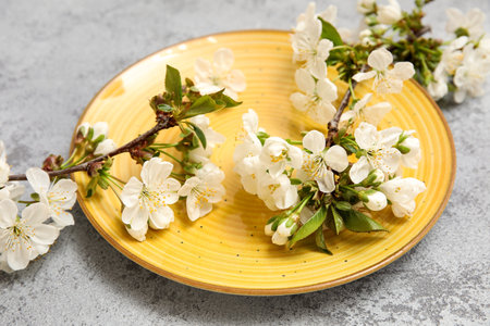 Clean yellow plate with blooming branches on gray background, closeup