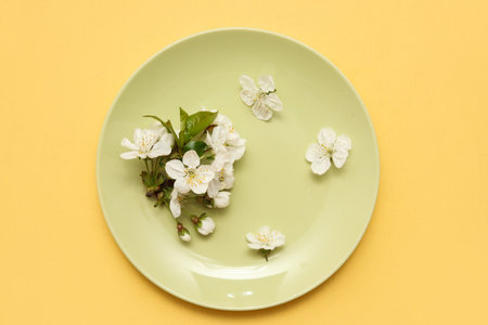 Clean green plate with blooming branch on yellow background